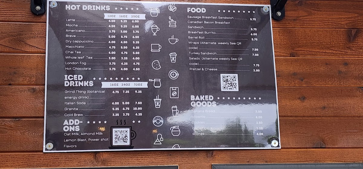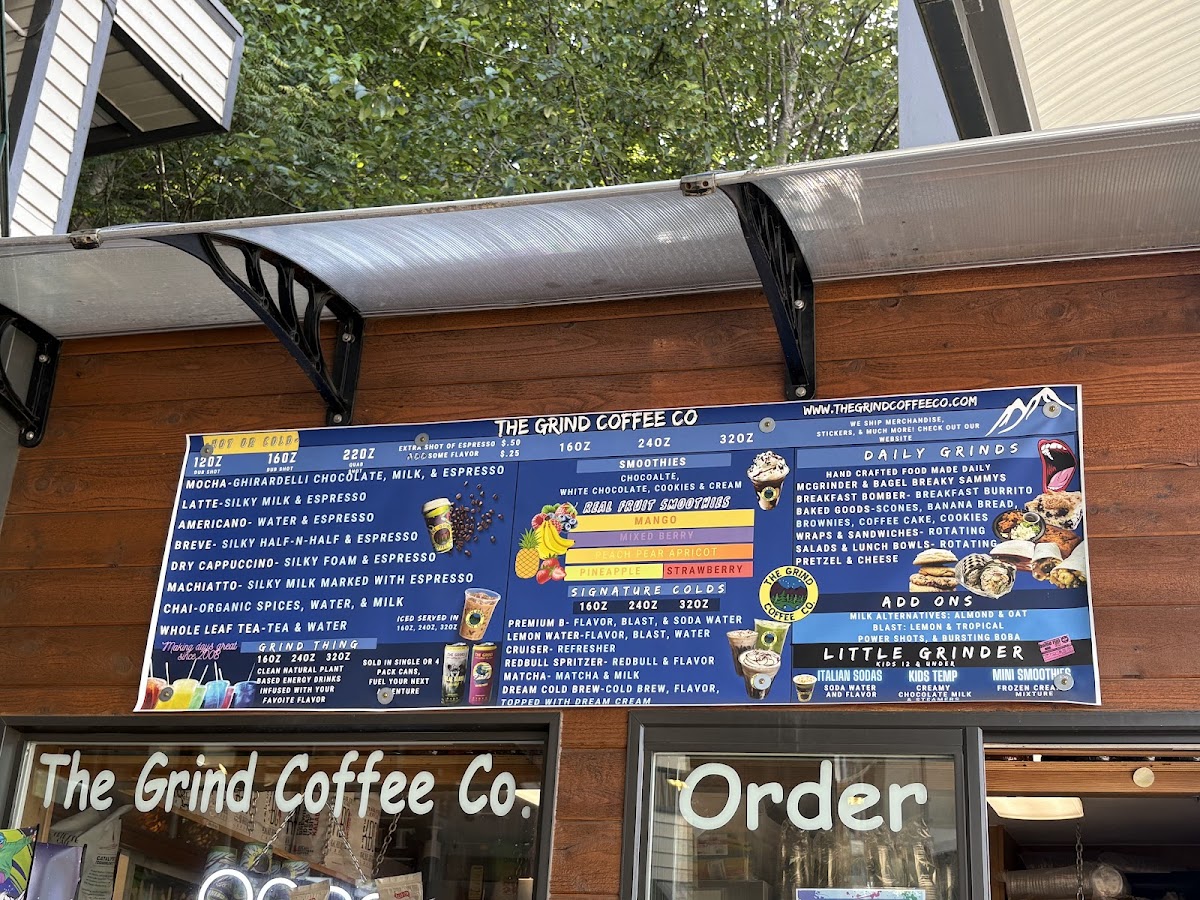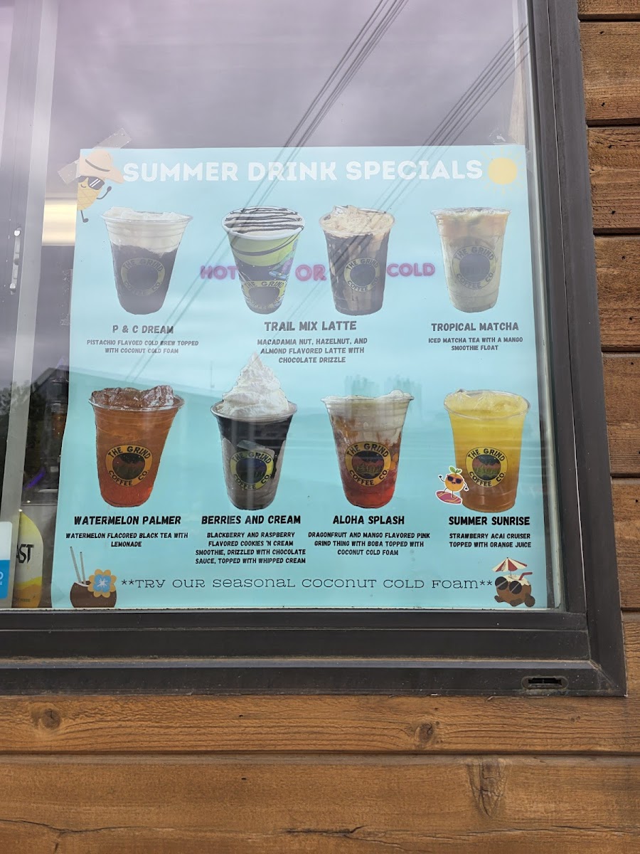 The menu at The Grind Coffee Co. offers a delightful variety of drinks and food, making it a great spot for both casual coffee lovers and those looking for a satisfying meal. For those with a sweet tooth, the fruity flavors range from Blackberry to Cantaloupe, with options like Blue Curacao and Blue Raspberry available. The coffee aficionados will enjoy unique flavors like Almond, Carmel, and Hazelnut. Signature cold drinks such as the Premium B, Lemon Water, and Matcha provide refreshing options, while the Cruiser Redbull Spritzer is perfect for a bit of energy. The summer drink specials are a real treat, featuring the P&C Dream, Trail Mix Latte, and the tropical Watermelon Palmer. If you're craving something hot, choices like the classic Latte, Mocha, and Dry Cappuccino are available, alongside iced offerings such as the Grind Thing and Cold Brew. For food, there's a tasty selection of breakfast items like the Sausage Breakfast Sandwich, Canadian Bacon Breakfast Sandwich, and the hearty Breakfast Burrito Barrel Roll. Wraps and salads round out the savory menu, while the baked goods, including Banana Bread and a rich Brownie, make for perfect snacks or desserts. Whether you're stopping by for a quick coffee or a full meal, The Grind Coffee Co. offers a well-rounded menu that satisfies a variety of cravings.